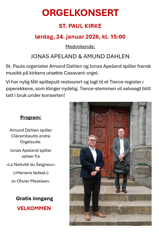 Orgelkonsert 24.01.2026 i St. Paul kirke kl. 15