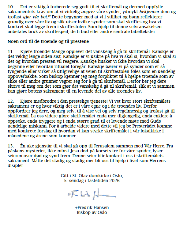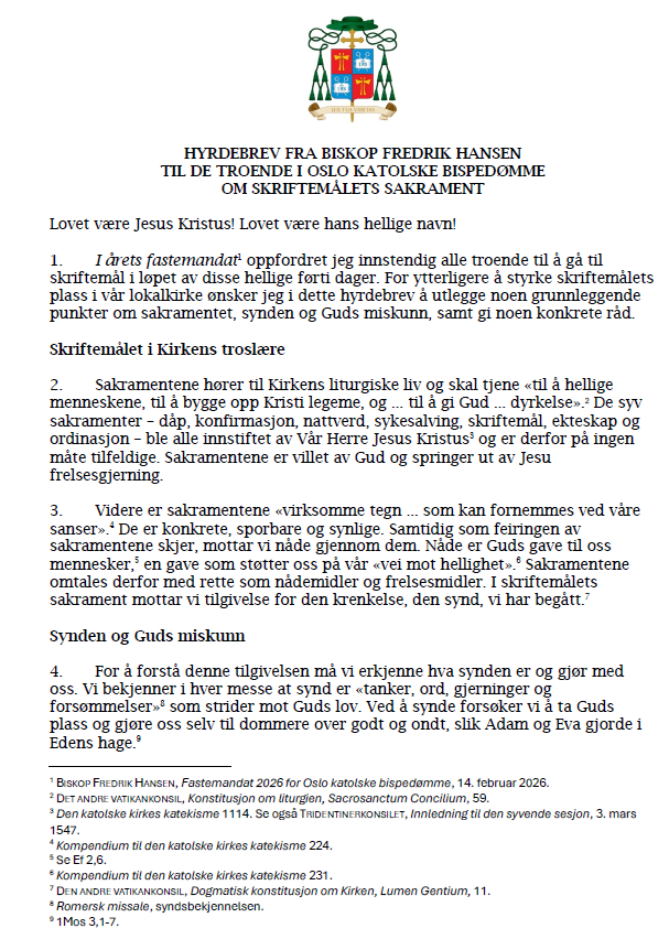 Aktuelt Biskopens hyrdebrev om skriftemålets sakrament 22.03.2026 21/03/2026 PS: Vil du fordype deg i skriftemålet? Biskop Fredrik har skrevet en liten bok om skriftemålets sakrament. Den heter “Vend om!” og selges på menighetskontoret (75 kr).