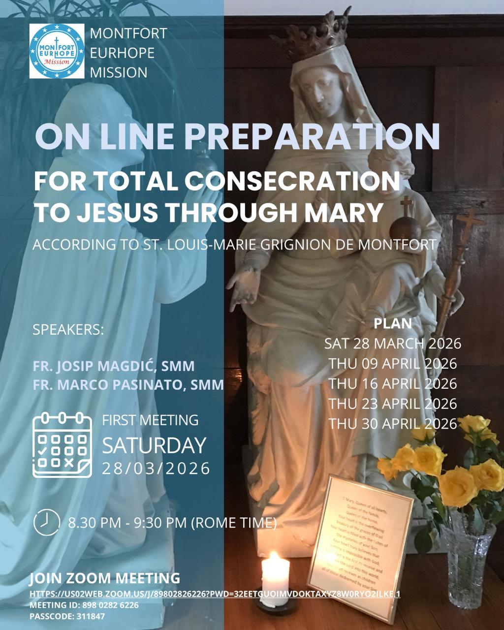 Velkommen til digitale samlinger for å lære mer om Montforts spiritualitet, for å kunne forberede deg til å gjøre total konsekrasjon til Jesus gjennom Jomfru Maria, som etter Montfort er “den perfekte fornyelsen av dåpsløftene”. For mer informasjon, kontakt gjerne oss i Maria, Alle Hjerters Dronning, https://bergen.katolsk.no/?page_id=18756